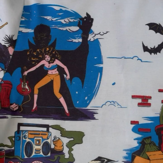Settle in for pure comfort and maximum chaos! Our Vampire Punks pattern features our most off the wall print yet, as a gang of punks tries to survive the night against blood sucking fiends.